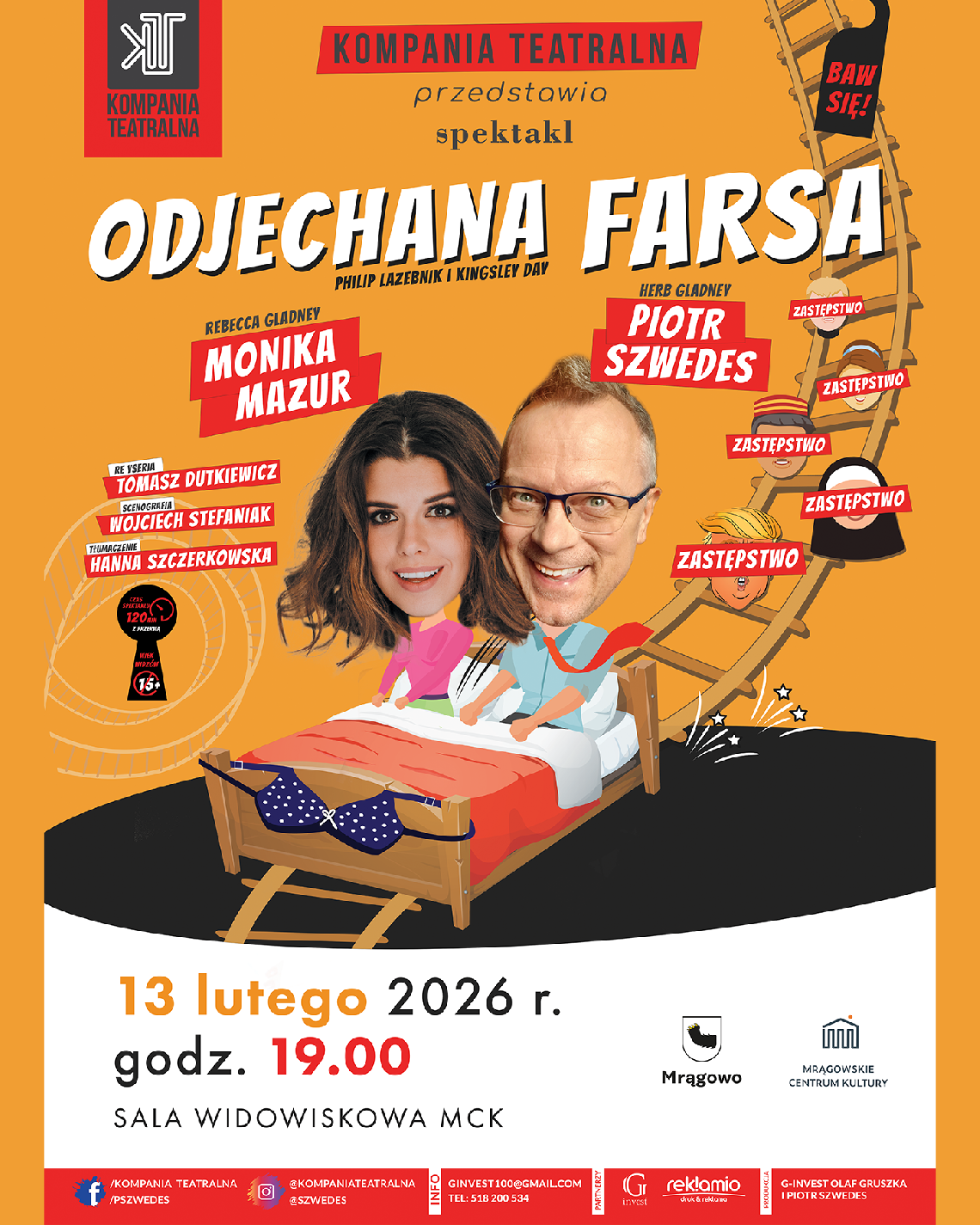 Zapraszamy do Mrągowskiego Centrum Kultury na spektakl "Odjechana farsa", piątek, 13 lutego 2026 r., godz. 19.00. ( 20 min. drogi od zamku )